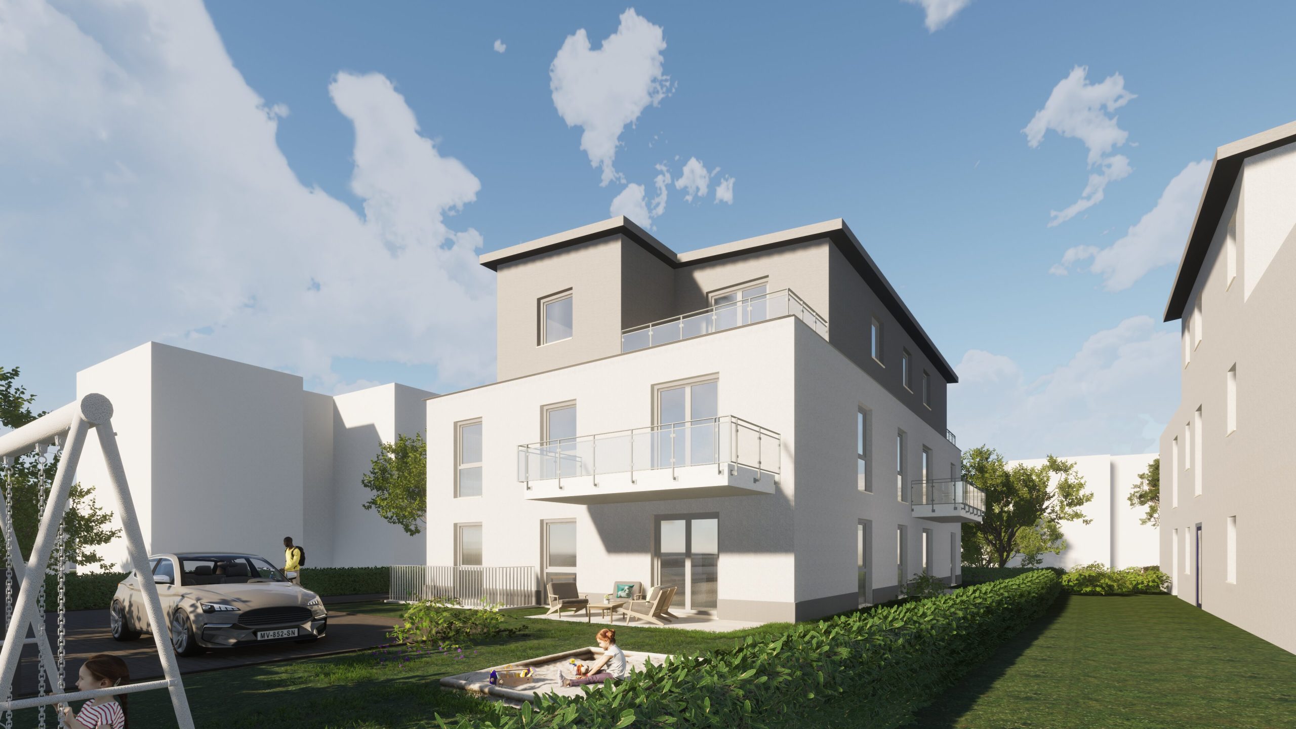 Die Wohnanlage zeichnet sich durch helle, moderne und geradlinig angelegte Raumstrukturen aus. Kurze Flurwege erzeugen eine großzügige Wirkung der einzelnen Wohneinheiten. Die Einheiten im Erdgeschoss verfügen angegliedert an ihre Terrassenbereiche um Sondernutzungsrechte des Grundstückes. Es werden zwei Außenstellplätze im hinteren Bereich des Grundstückes sowie ausreichend Fahrradstellplätze geschaffen. Ein ebenerdiger Hauseingang bietet Barrierefreiheit im Erdgeschoss.